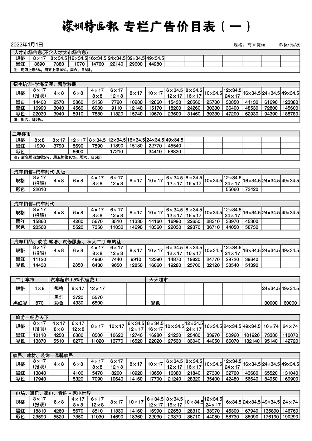 深圳特區(qū)報(bào)專(zhuān)欄廣告價(jià)目表