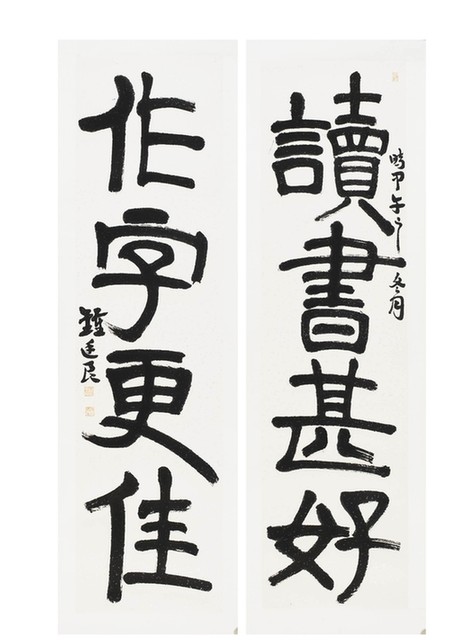 鐘廷良學(xué)書(shū)的過(guò)程離不開(kāi)他的收藏,也得益于他的收藏!2011年收得清代書(shū)壇巨匠伊秉綬一副對(duì)聯(lián)后,細(xì)細(xì)研摩臨寫。此后,也有所悟所得。2012年收得民國(guó)舊拓“泰山金剛經(jīng)”集聯(lián)后,對(duì)泰山金剛經(jīng)刻石奉為至尊,敬若神明。爾后,凡作大字,皆以其為架構(gòu),而其書(shū)也漸有可觀者。由于長(zhǎng)期從事文字工作之關(guān)系。讀書(shū),亦成了鐘廷良生活的一部分。其深知唯有讀書(shū)方能為書(shū)法注入養(yǎng)分。唯有知識(shí)方能豐富書(shū)法內(nèi)涵。鐘廷良的書(shū)法,尊崇于中國(guó)傳統(tǒng)文化所倡導(dǎo)的書(shū)論和畫理。在學(xué)習(xí)古人、先賢經(jīng)典的基礎(chǔ)上,小心求索,認(rèn)真創(chuàng)作。既注重以古為師,又融匯時(shí)代精神,孜孜不倦,其書(shū)漸入佳境。