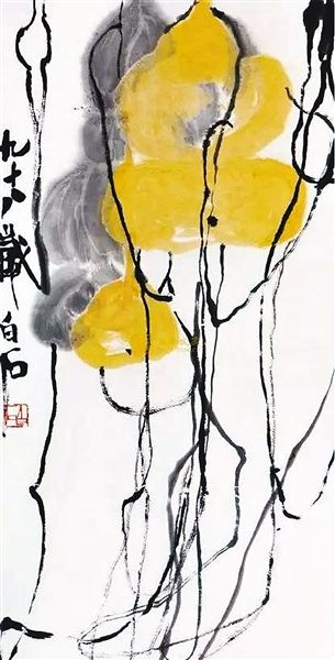 齊白石的《葫蘆》,被稱為是齊白石的絕筆,據(jù)說(shuō)當(dāng)時(shí)齊白石為了畫這幅畫,一天早晨起來(lái),沒(méi)有人攙扶,他自己從臥室踉踉蹌蹌地走進(jìn)畫室,站在桌前,擼起袖子,畫下了這一幅畫。據(jù)畫家李可染回憶,當(dāng)時(shí)的齊白石已經(jīng)是老糊涂了,“九”字不知道該怎么寫,到了“歲”就直接寫錯(cuò)了,只能夠憑自己的直覺(jué)畫畫,即便是畫了一輩子的畫,但是到最后由于體力和腦力的不支,實(shí)在是畫不出來(lái)了。齊白石一開(kāi)始用黃墨去畫葫蘆,畫下正確的一筆,一大一小,一前一后,一上一下。但當(dāng)他接著去畫葉子的時(shí)候出錯(cuò)了,把葉子順即也畫成了葫蘆,且葫蘆留白處冒出兩筆淡墨,就好像葫蘆被打了兩個(gè)洞。當(dāng)畫藤蔓時(shí),又恍惚了,畫著畫著又成葫蘆了。齊白石老人在做這幅畫時(shí)已經(jīng)是精力透支了,能畫出樣子來(lái)已經(jīng)實(shí)屬不易了,但是我們可以看到,其實(shí)齊老畫的這幅畫是別有一番風(fēng)韻在的,比如說(shuō)他畫的藤蔓,這藤蔓真是絕了,能夠在不知不覺(jué)中畫出葫蘆的成熟、滄桑,把經(jīng)過(guò)風(fēng)吹雨打后形成的那種彎曲,表現(xiàn)得淋漓盡致。