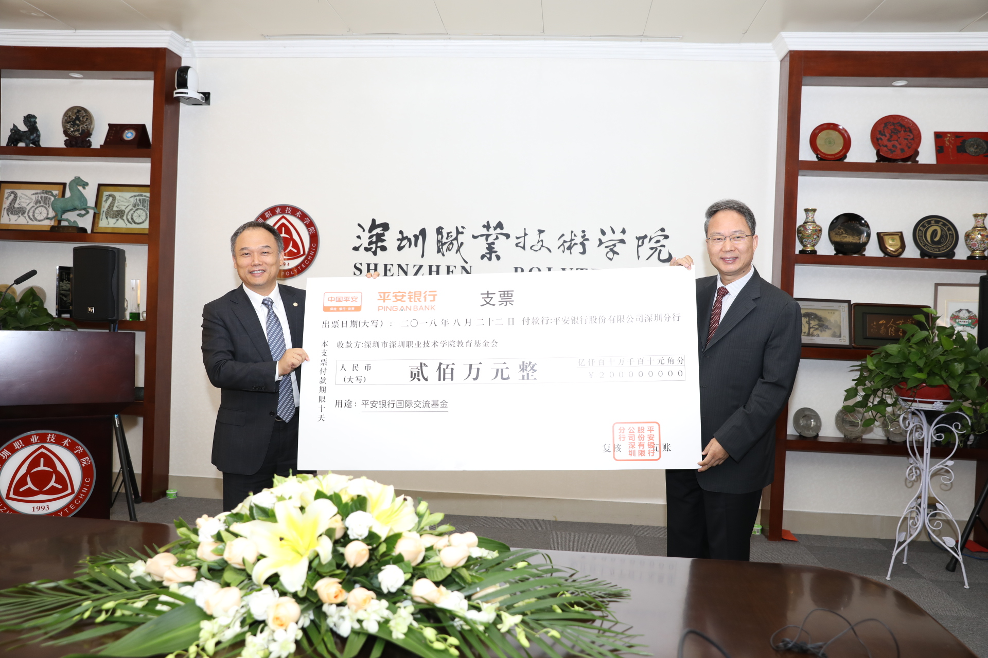 2018年11月22日,平安銀行與深圳職業(yè)技術(shù)學院校園一卡通項目交付儀式暨國際交流基金捐贈儀式在深圳職業(yè)技術(shù)學院101會議室隆重舉行。平安銀行行長助理、深圳分行楊志群行長、孫芳滔副行長、陳宏敬副行長、高寒竹零售總監(jiān),深圳職業(yè)技術(shù)學院陳秋明黨委書記、唐曉鳴副校長、董朝君副校長等領導出席了儀式。