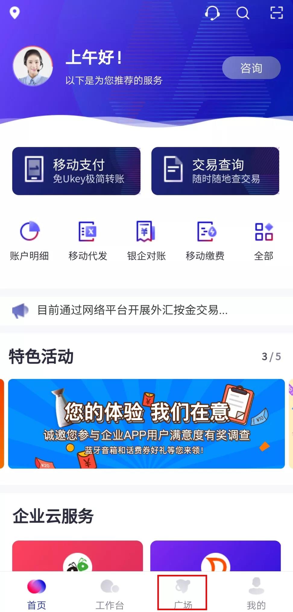 打開招商銀行企業(yè)App,點擊“廣場”板塊,找到深圳專區(qū)。