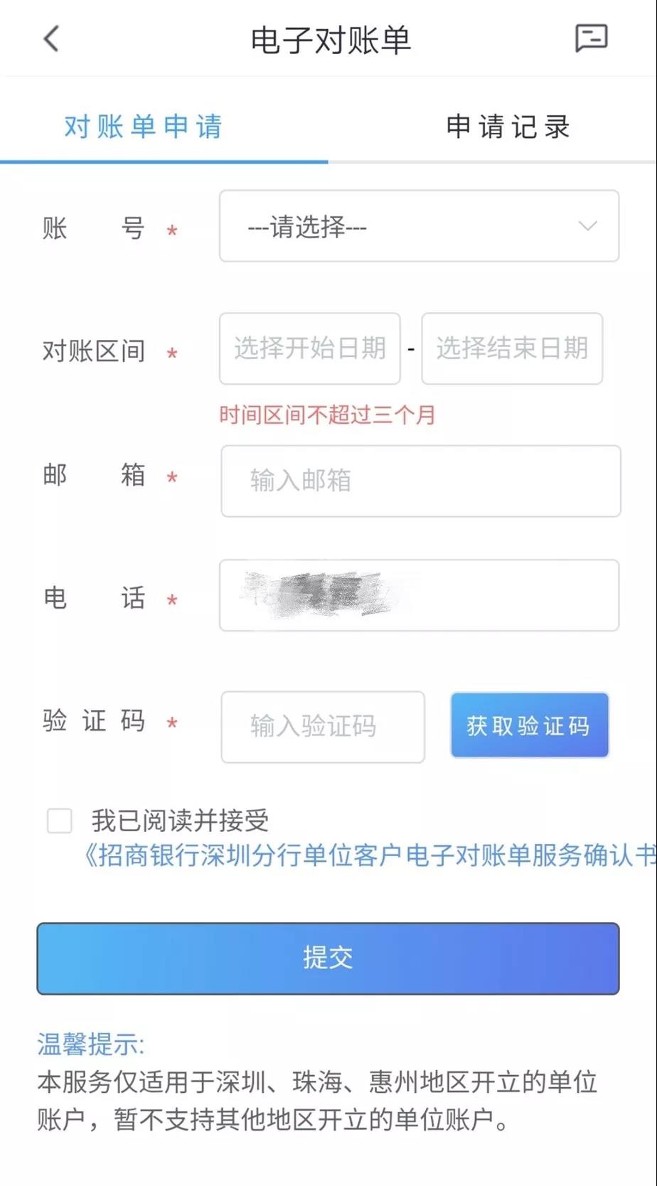點擊電子對賬單,填寫對賬單申請,輸入查詢賬號和日期、接收郵箱,獲取短信驗證碼,點擊提交。