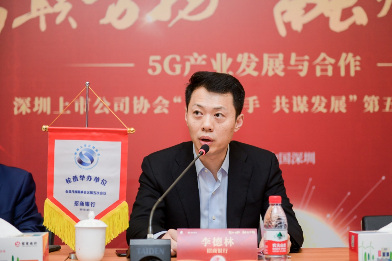 7月11日下午,由深圳上市公司協(xié)會牽頭、招商銀行股份有限公司主辦的“智聯(lián)萬物,融智有招——5G產(chǎn)業(yè)發(fā)展與合作”會員月度圓桌會議第五次會議在招商銀行深圳分行大廈3樓多功能廳成功舉行。深圳市證監(jiān)局處長梁文利、協(xié)會會長麥伯良、協(xié)會執(zhí)行副會長兼秘書長黃鐵軍、招商銀行總行行長助理李德林、總行董事會辦公室主任霍建軍等領導出席了本次活動,本次活動邀請了來自信息技術、制造、金融、地產(chǎn)等5 G行業(yè)的40家上市公司董事長、總經(jīng)理等60余人參加活動,行業(yè)專家齊聚一堂,共話5G發(fā)展浪潮中的機遇與挑戰(zhàn)。