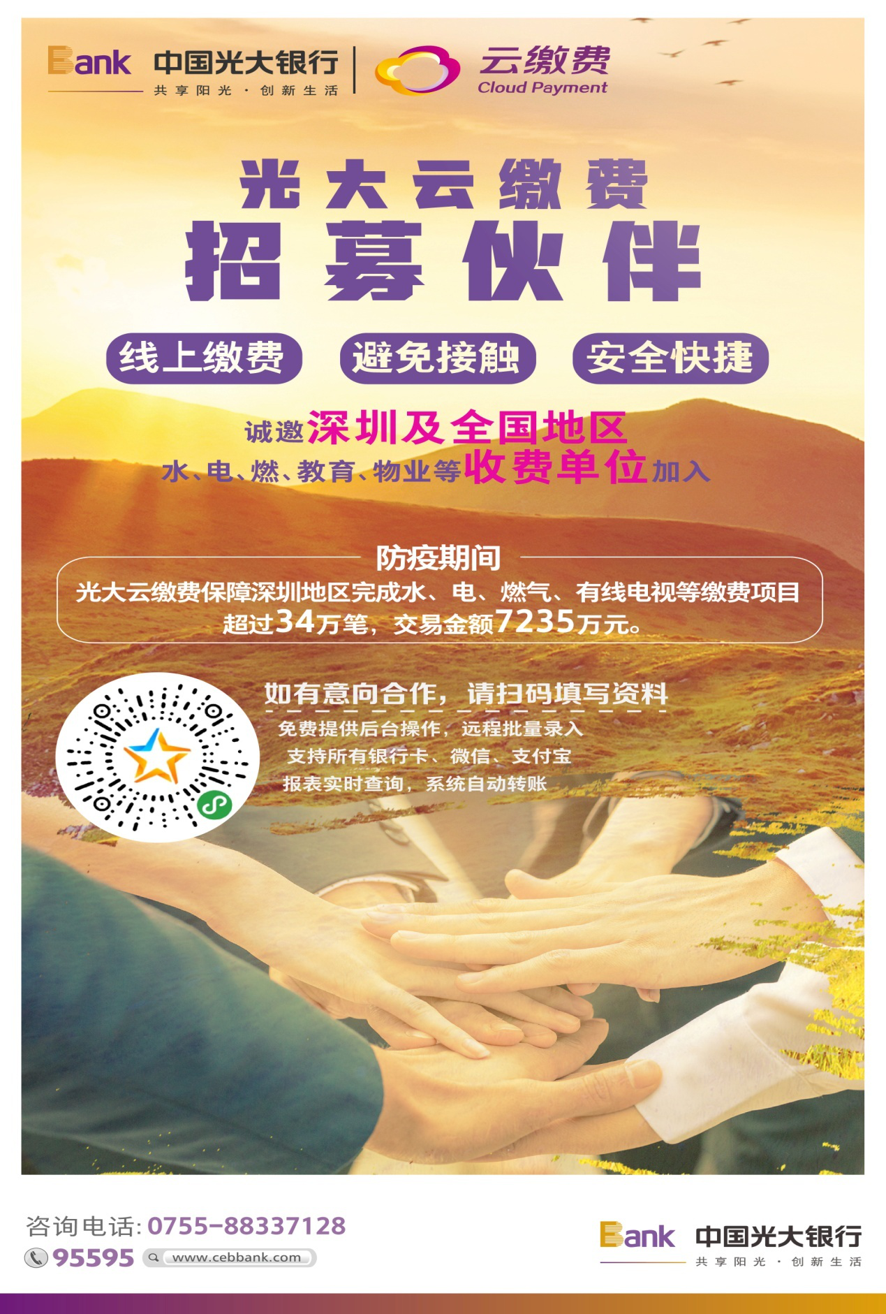 見圳客戶端·深圳新聞網2月26日訊 守望相助,共克時艱。面對新型冠狀病毒疫情防控的緊張形勢,為有效阻斷病毒傳播渠道,光大銀行深圳分行積極響應國家號召,充分發(fā)揮云繳費線上便民繳費服務優(yōu)勢,全力保障全國,特別是重點地區(qū)水、電、燃等主要生活繳費線上通道穩(wěn)定暢通運行,足不出戶,完成各類繳費,最大限度降低了居民的出行風險,全面助力打贏“防疫”阻擊戰(zhàn)。
