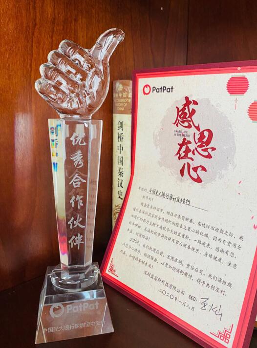 深圳新聞網(wǎng)3月16日訊 2020年新春伊始,光大銀行深圳寶中支行收到來自PATPAT平臺發(fā)來的感謝信,榮獲PATPAT平臺頒發(fā)的“優(yōu)秀合作伙伴”獎。