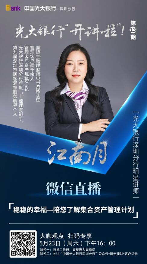 此次,光大銀行深圳分行攜手《深圳晚報(bào)》邀請(qǐng)CFP資格認(rèn)證國際金融理財(cái)師、該行年度“十佳理財(cái)能手”、明星講師江南月帶來《穩(wěn)穩(wěn)的幸福——陪您了解集合資產(chǎn)管理計(jì)劃》主題分享,幫助更多客戶深入了解并購買集合資產(chǎn)管理計(jì)劃產(chǎn)品。講師江南月將從集合資產(chǎn)管理計(jì)劃的基本概念和產(chǎn)品優(yōu)勢出發(fā),深入淺出,讓更多客戶了解集合資產(chǎn)管理計(jì)劃產(chǎn)品,并幫助客戶選擇購買這類產(chǎn)品。該行代銷的純債類集合資產(chǎn)管理計(jì)劃一直以來都以穩(wěn)健著稱,目前已到期產(chǎn)品全部達(dá)到了業(yè)績比較基準(zhǔn),設(shè)置超額收益的產(chǎn)品也都為客戶實(shí)現(xiàn)了超額回報(bào)。