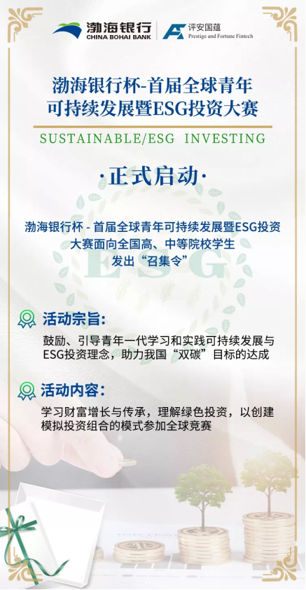讀特客戶端 ·深圳新聞網(wǎng)8月16日訊 (通訊員 張曦)近日,由渤海銀行股份有限公司(以下簡稱“渤海銀行”)冠名,評安國蘊(北京)科技有限公司(以下簡稱“評安國蘊”)聯(lián)合 ACME現(xiàn)代經(jīng)濟學社、 GIC全球投資委員會共同承辦的首屆“渤海銀行杯 ·全球青年可持續(xù)發(fā)展暨 ESG投資大賽”正式啟動!8月9日起,活動冠名方——渤海銀行面向年滿16周歲的全國高、中等院校學生發(fā)出了“召集令”。