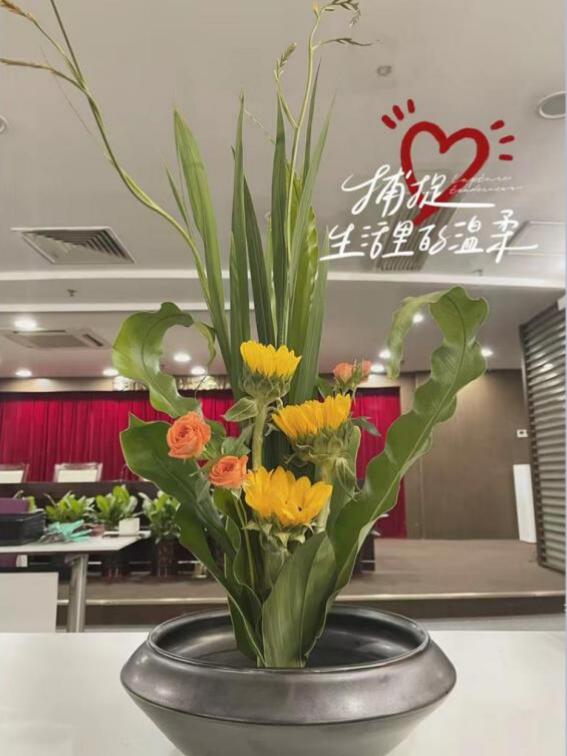 活動現(xiàn)場,馮老師詳細介紹了傳統(tǒng)花藝的歷史文化、插花造型、色彩搭配、器具應用等基礎知識,從花語寓意、花材修剪、構(gòu)圖等方面深入淺出的講解插花的要點。在悠然的花香浸染間,輕柔的音樂熏陶中,大家按照馮老師展示的步驟,將花朵、樹葉精心剪裁、混搭、點綴成束,將一朵一朵鮮花、綠葉錯落有致地插在花盆中里,普通的花葉、枝條,經(jīng)過大家精巧的修飾與加工之后,變成了令人賞心悅目的藝術(shù)品。整個會場花香四溢,歡聲笑語,充滿了輕松歡快的氛圍。