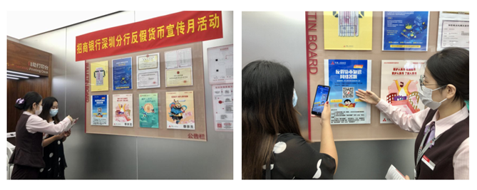 在深圳招行的各營業(yè)網(wǎng)點,成立了“支行守衛(wèi)隊”。依托網(wǎng)點優(yōu)質(zhì)設(shè)施資源,各網(wǎng)點通過懸掛主題宣傳橫幅、LED屏幕滾動播放、在廳堂、等候區(qū)、柜臺等醒目位置擺放反假知識宣傳折頁和海報等方式,營造傳統(tǒng)模式宣傳好氛圍。此外,在網(wǎng)點設(shè)立的營業(yè)廳小課堂,現(xiàn)場講解現(xiàn)行流通人民幣的票面知識、防偽特征及識別方法;制作“2021海報答題”海報引導(dǎo)市民掃碼,開展答題有禮的方式提高大家的參與積極性,寓教于樂開展了反假幣知識的宣傳。