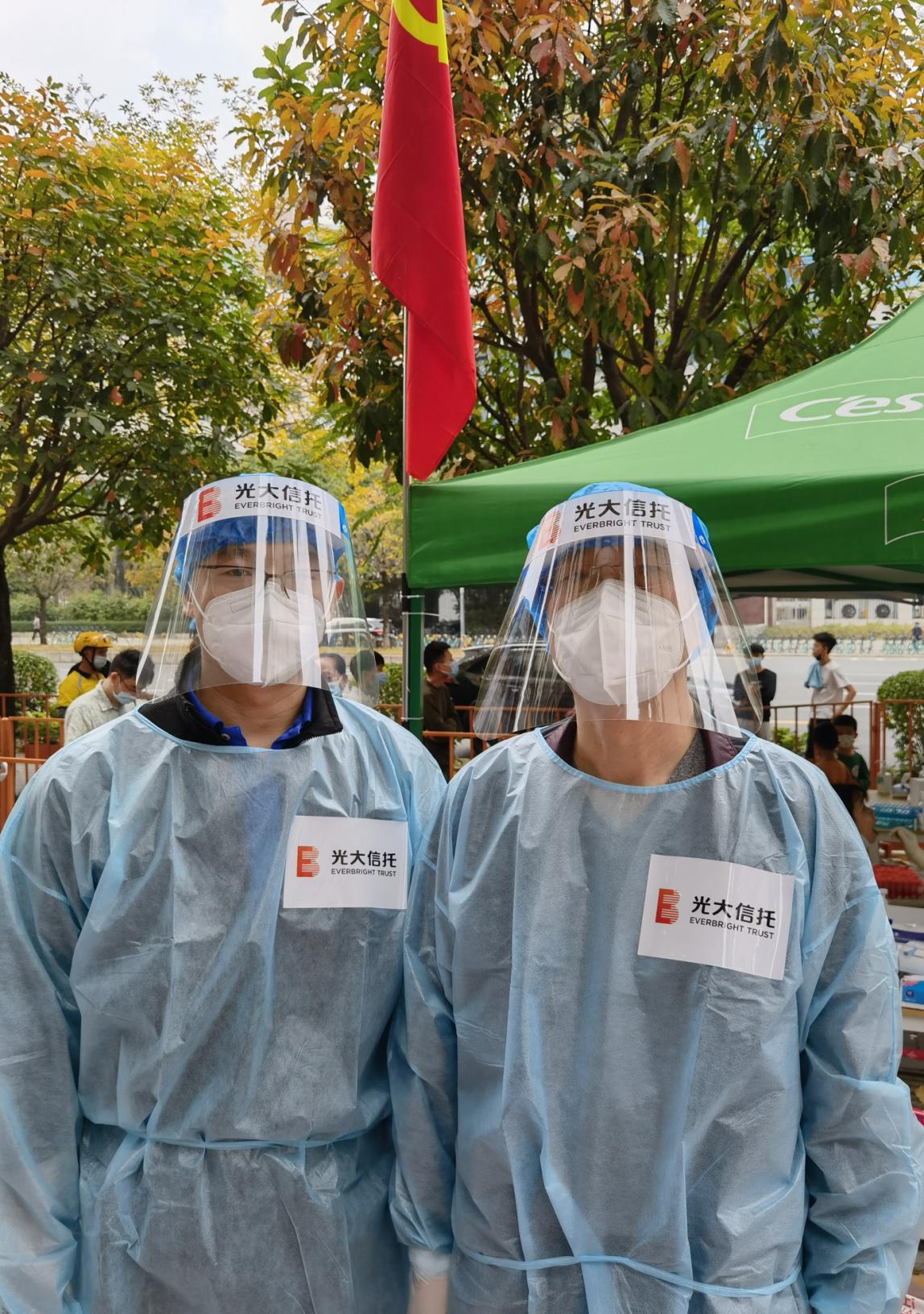 光大信托深圳區(qū)域黨支部在接到協(xié)同抗疫通知后,第一時(shí)間組織黨員和員工積極報(bào)名參與志愿服務(wù)。3月5日,恰逢毛澤東主席“向雷鋒同志學(xué)習(xí)”題詞的紀(jì)念日,光大信托公司風(fēng)險(xiǎn)總監(jiān)姚恒民同志以年近6旬的高齡,率先垂范的沖在一線,帶領(lǐng)深圳區(qū)域黨員同志們,投入福田區(qū)蓮花街道獅嶺社區(qū)的核酸檢測(cè)志愿服務(wù)工作,用實(shí)際行動(dòng)和赤誠情懷書寫共產(chǎn)黨員的責(zé)任和擔(dān)當(dāng)。當(dāng)天天氣炎熱,太陽暴曬下穿著防護(hù)服兩個(gè)小時(shí)工作下來,全身已完全濕透,但他們以飽滿的激情、負(fù)責(zé)任的態(tài)度詮釋了一個(gè)共產(chǎn)黨員在黨旗下宣誓的誓言。光大信托的一位黨員同志說:“疫情就是命令,防控就是責(zé)任,崗位就是戰(zhàn)場(chǎng),每個(gè)服務(wù)點(diǎn)的黨旗就是一種信仰,每個(gè)黨員就是一面旗幟,每個(gè)黨支部就是一個(gè)堡壘,哪里有需要,哪里就有光大人的身影?!?/p>