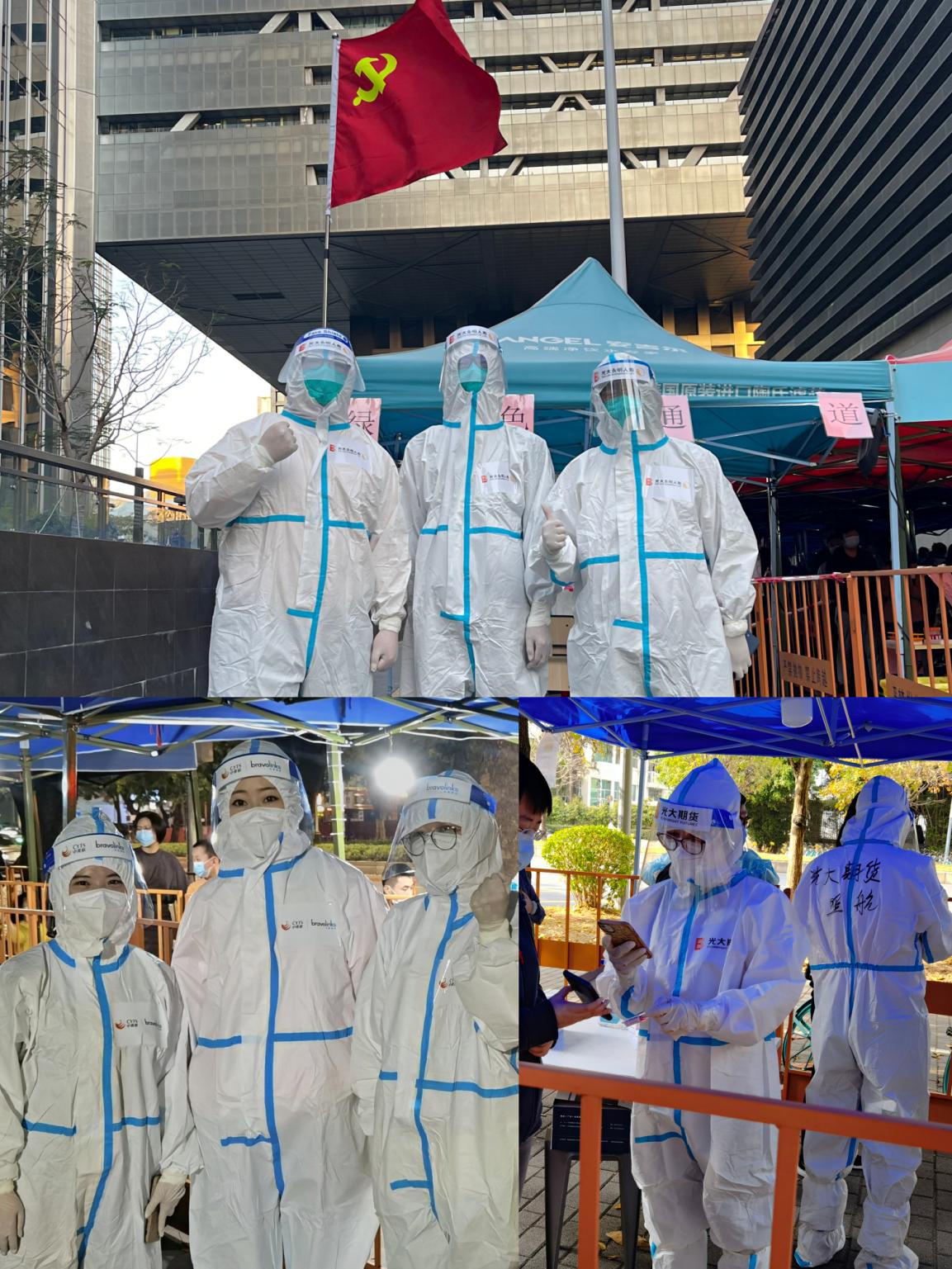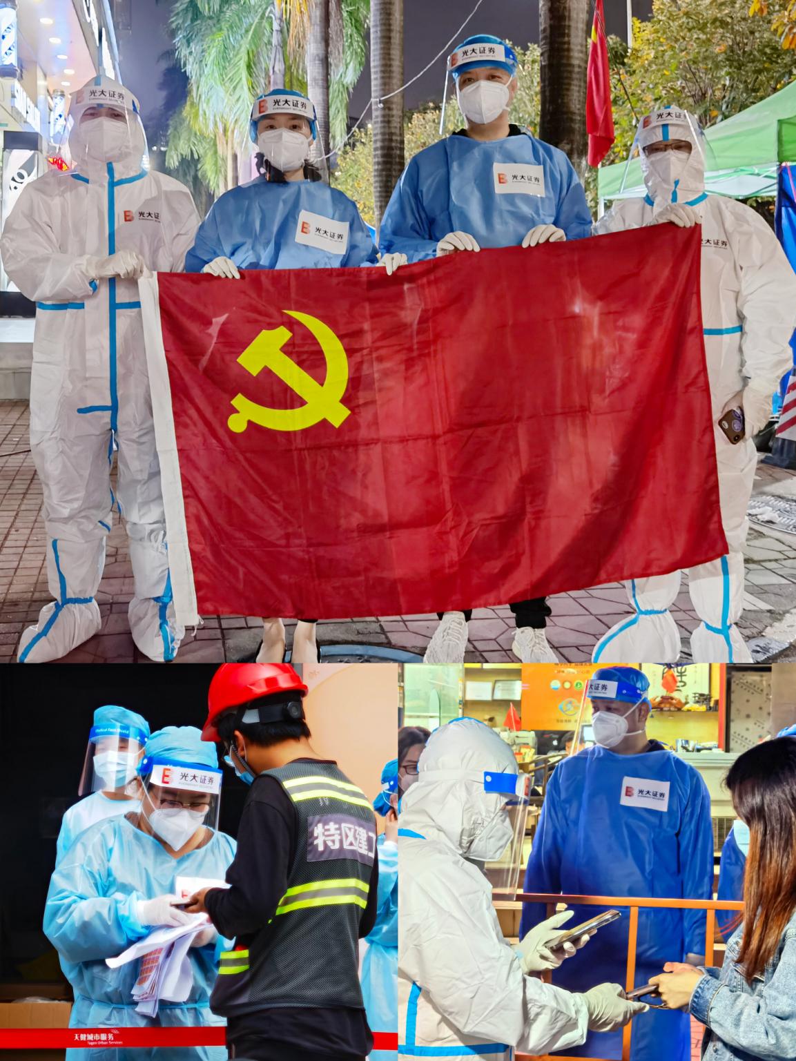 光大證券深圳分公司發(fā)揮基層黨組織戰(zhàn)斗堡壘作用和黨員先鋒模范作用,黨員干部迅速牽頭組建了“光證深分先鋒隊(duì)”,下沉基層抗疫一線,黨員同志們換上防護(hù)服、手套和隔離面罩深入蓮花街道多個(gè)社區(qū),全力協(xié)助醫(yī)護(hù)人員做好核酸檢測(cè)的輔助工作。從白天到黑夜的堅(jiān)守,頂著溫差很大的深夜寒風(fēng),保持良好狀態(tài),為廣大群眾的身體健康安全提供了有力保障。一句句暖心的提示、一個(gè)個(gè)忙碌的身影,光大證券深圳分公司的志愿者們,用實(shí)際行動(dòng),堅(jiān)定地守護(hù)著鵬城的人們!