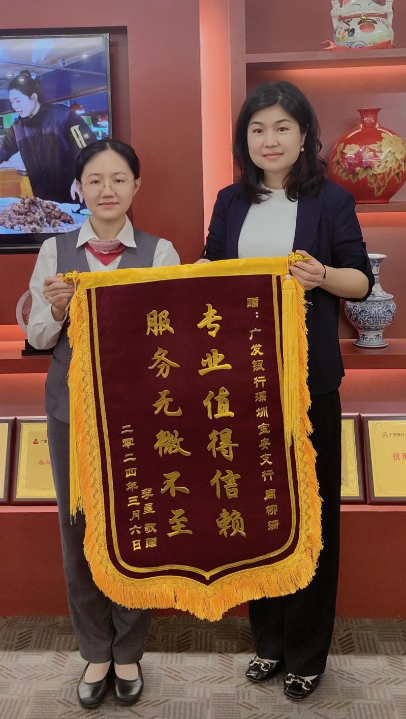 深圳新聞網(wǎng)2024年5月11日訊(記者 朱琳)“真的太感謝廣發(fā)銀行了!要不是廣發(fā)銀行專業(yè)高效的服務(wù),我這筆貨款都不知何時(shí)能付出去!”小微企業(yè)主李先生握著廣發(fā)銀行深圳寶安支行服務(wù)經(jīng)理周柳珊的手激動(dòng)地說,隨后將一面印有“服務(wù)無微不至,專業(yè)值得信賴”的錦旗送到她的手中,向該行熱情、高效、暖心的服務(wù)表示感謝。錦旗上十二個(gè)金燦燦的大字寄托了客戶對廣發(fā)銀行沉甸甸的信任和堅(jiān)定不移的支持。