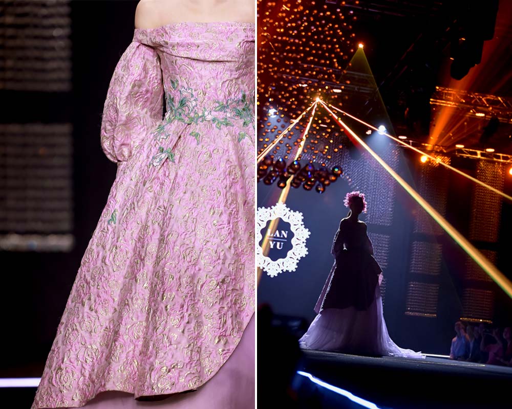 盛典秀場真實還原了巴黎時裝周舞臺,讓觀眾擁有了極致的感官體驗。40余套不同風(fēng)格的禮服傾情展出設(shè)計中如同水墨畫恣意揮灑的筆墨,將山河間幽深、清遠、縹緲的東方韻味表現(xiàn)得淋漓盡致。