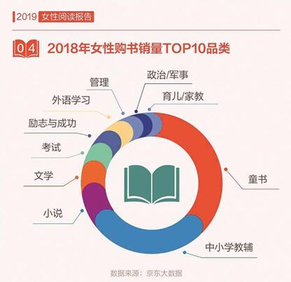 京東大數(shù)據(jù)顯示,女性的讀書量顯著提升,2018年,女性讀者人均購書7.6本,高于男性,女性讀者在紙質(zhì)書購買上的人均消費近230元,女性的“閱讀力”正在變得越來越強。從圖書銷量上看,2018年女性讀者購買最多的圖書是童書、中小學(xué)教輔、小說、文學(xué)和考試,可見對于大部分女性而言,購書的主要目的是出于育兒的需求。