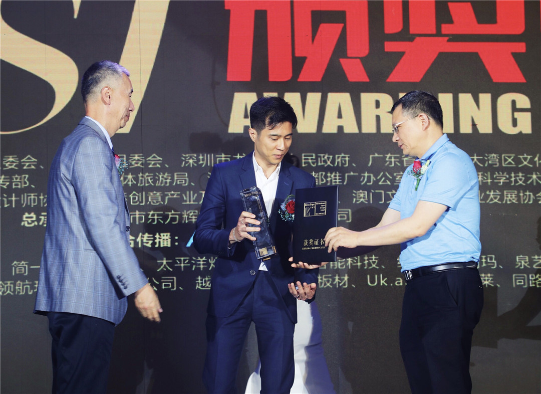 △深圳市政協(xié)提案委員會副巡視員魏威與清華大學美術學院博士生導師張月、為上海黑泡泡建筑裝飾設計工程有限公司設計師代表頒發(fā)“最佳會所設計獎”