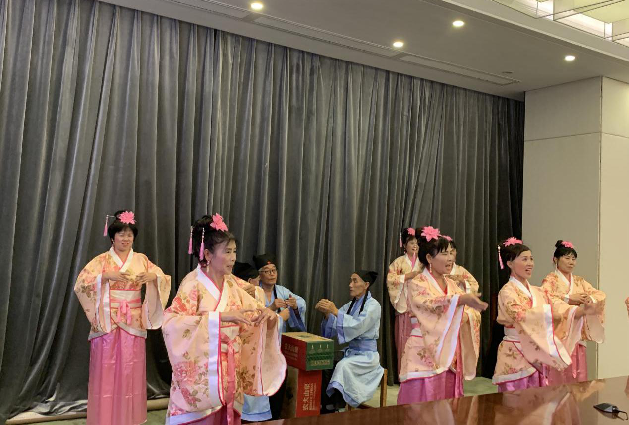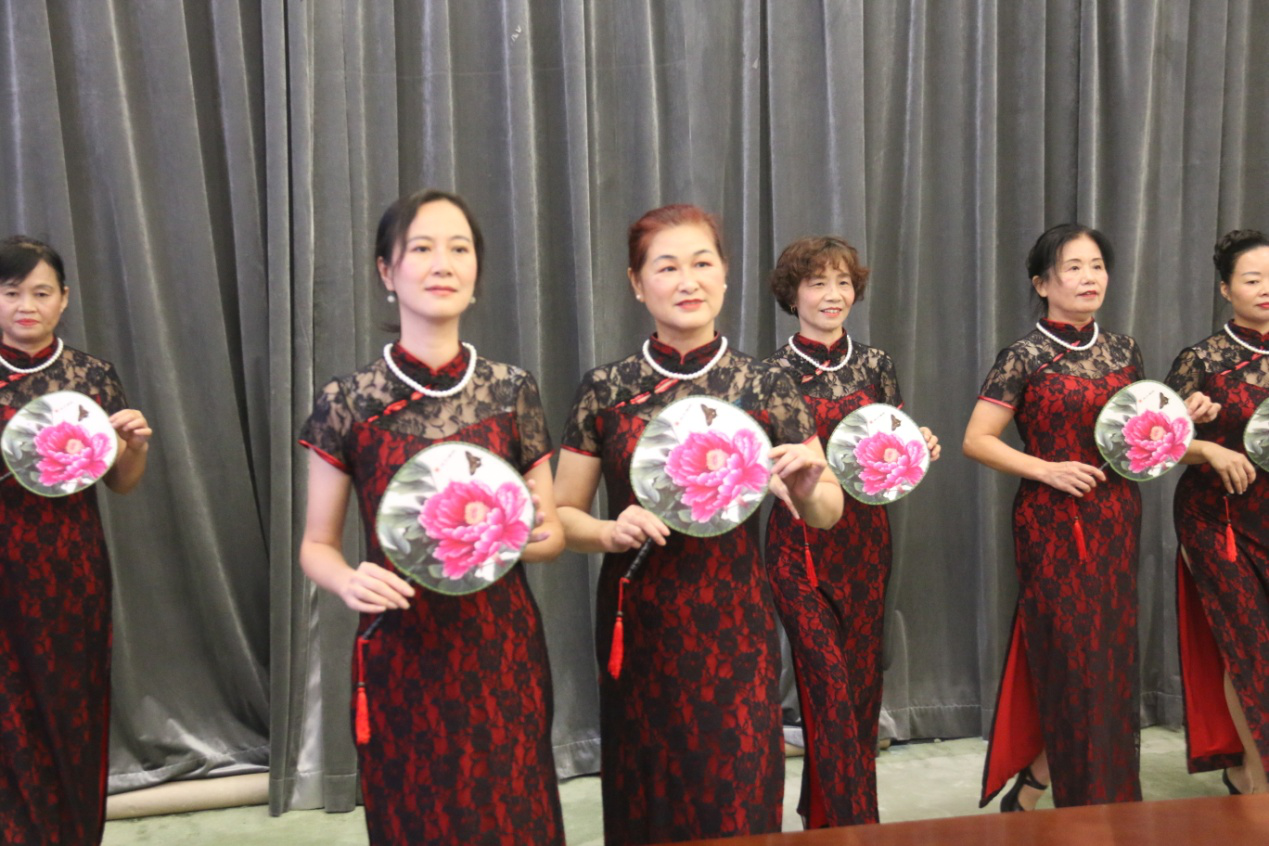 眾人矚目的文藝展演終于來了,社區(qū)居民的表演可圈可點、耐人尋味。旗袍秀詩誦《春江花月夜》,詩美、舞美、樂美、人更美,以故為新,別具一番味道;《將進(jìn)酒》詩舞誦也頗有看頭,從服裝、道具、編排處處有新意,足見大家的用心,將詩詞、舞蹈與音樂融于創(chuàng)作中,給在場居民帶來了耳目一新的觀賞體驗。