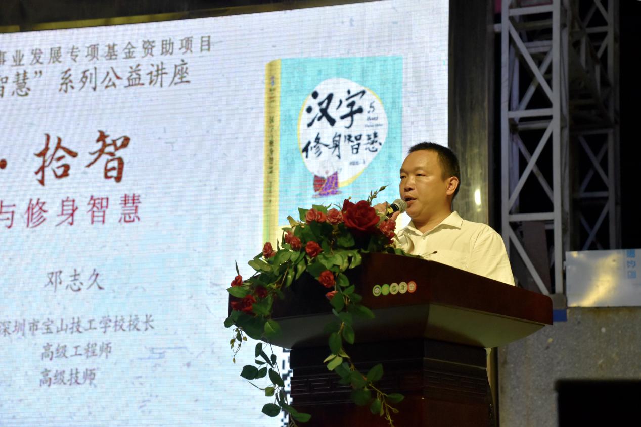深圳新聞網(wǎng)訊 9月18日晚上7時,由深圳市閱讀聯(lián)合會、深圳市壹書文化傳播有限責(zé)任公司和寶山讀書會共同主辦的“‘識字拾智’——對話漢字與修身智慧”公益文化講座在寶山技工學(xué)校寶山大舞臺拉開了序幕。據(jù)悉,這是由深圳市宣傳文化事業(yè)發(fā)展專項基金資助項目“漢字的修身智慧”的第三場公益文化講座,以劉建彪《漢字與修身智慧》新書分享為契機,傳播漢字正能量,讓更多的青少年識字長智,領(lǐng)略漢字文化之精妙。