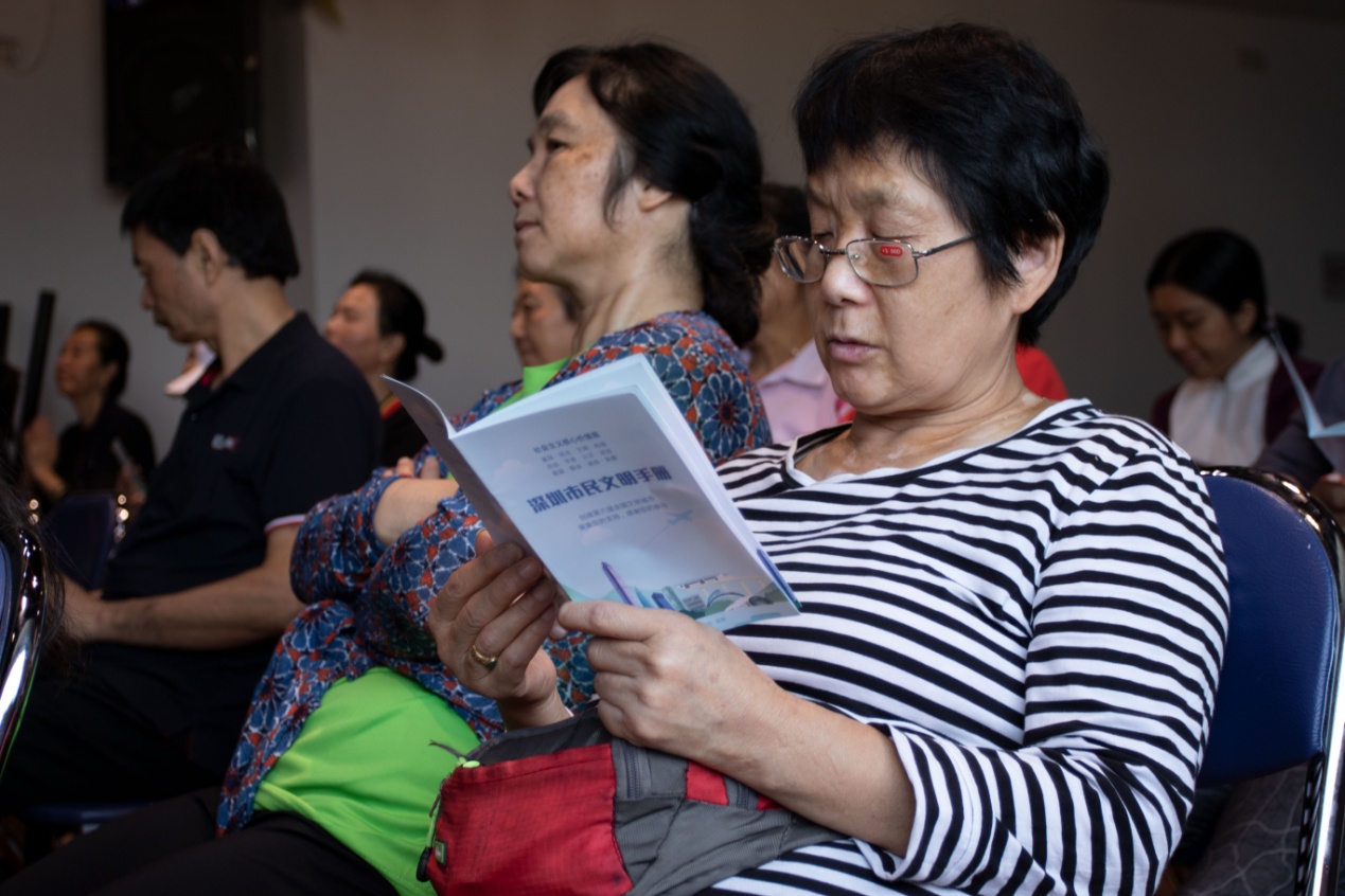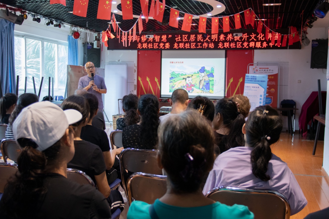 11月13日上午,本系列活動的第六場講座在龍聯(lián)社區(qū)工作站拉開了序幕。講座開始前,現(xiàn)場聽眾每人手上都拿到一本《深圳市民公約》小手冊和《漢字與修身智慧》學(xué)習(xí)資料,劉建彪老師首先跟大家互動:“我們需要什么樣的家園?文明城市從哪里開始?”“美麗、溫馨、文明、和諧的家園”,臺下一位叔叔的聲音尤其洪亮,劉老師及時肯定了他的回答。劉老師接著說,文明城市從人開始,人是建設(shè)文明城市的中堅(jiān)力量,他進(jìn)一步補(bǔ)充道,做文明人的第一步是轉(zhuǎn)變思想,只有了解并認(rèn)同文明的重要性,才會自覺地踐行文明禮儀,積極參與城市文明的創(chuàng)建。