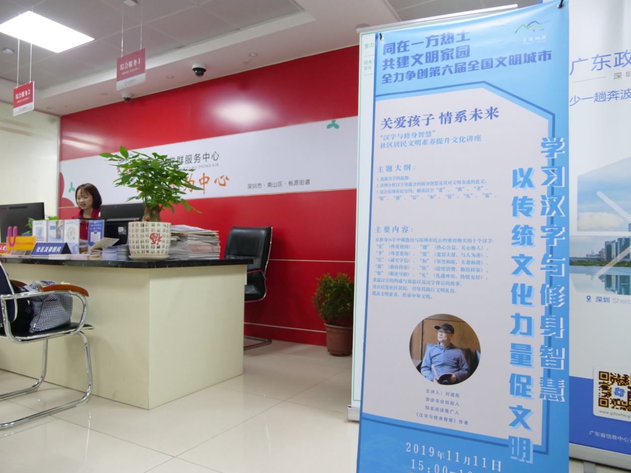 深圳新聞網(wǎng)訊 11月,桃源街道辦攜手壹書文化在該街道辦轄區(qū)內(nèi)12個(gè)社區(qū)開展12場“‘漢字與修身智慧’社區(qū)居民文明素養(yǎng)提升”專題講座,這是桃源街道辦創(chuàng)建第六屆全國文明城市迎檢工作、提升轄區(qū)居民文明素養(yǎng)的創(chuàng)新探索,邀請(qǐng)壹讀書會(huì)創(chuàng)始人、知名閱讀推廣人、《漢字與修身智慧》的作者劉建彪擔(dān)任主講嘉賓,從中華文明的基因(漢字)出發(fā),解讀深圳市民公約,旨在啟發(fā)居民在優(yōu)秀傳統(tǒng)文化的感召之下,踐行文明禮儀,用實(shí)際行動(dòng)去推進(jìn)文明城市的創(chuàng)建。