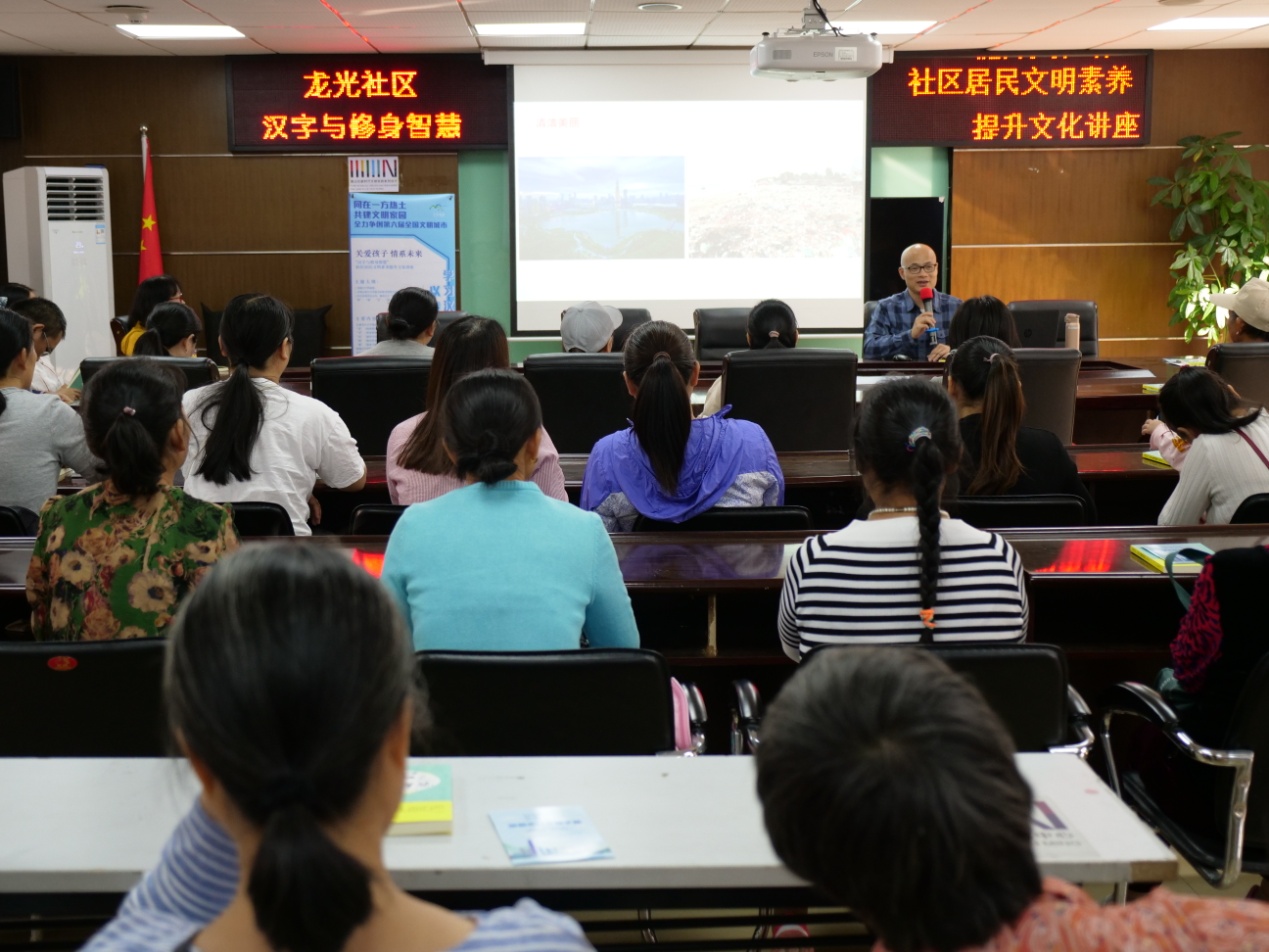 深圳新聞網(wǎng)訊 為更一步提升社區(qū)居民文化素養(yǎng),推動社區(qū)創(chuàng)建第六屆全國文明城市工作邁上新的臺階,11月19日下午,龍光社區(qū)工作站組織社區(qū)居民參加“‘漢字與修身智慧’社區(qū)居民文明素養(yǎng)提升”文化講座,邀請壹讀書會創(chuàng)始人、知名閱讀推廣人、《漢字與修身智慧》的作者劉建彪擔(dān)任主講嘉賓,從中華文明的基因(漢字)出發(fā),解讀深圳市民公約,旨在啟發(fā)居民在中華優(yōu)秀傳統(tǒng)文化的感召之下,踐行文明禮儀,用實(shí)際行動去推進(jìn)文明城市的創(chuàng)建。
