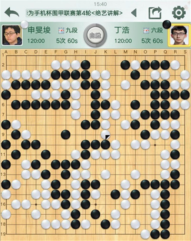 陶欣然執(zhí)白對陣鄔光亞。黑棋右邊攻擊白棋時候,連續(xù)失誤,反被白棋妙手吃通棋筋,黑已無法逆轉(zhuǎn)局面。有意思的是,賽前陶欣然遲到2分鐘被罰2分鐘,但絲毫不影響他獲勝。