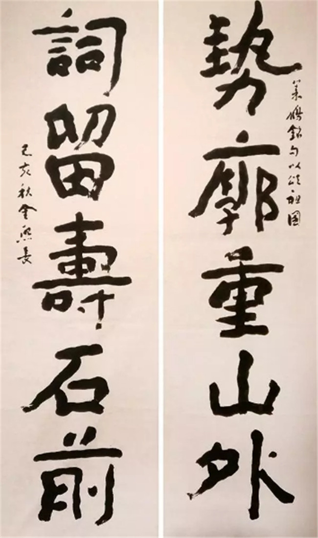“筆筆有出處,字字有來歷。每個字用筆中鋒但結(jié)字奇古;書風野逸但又視覺大氣。正如創(chuàng)作者所言:中國是歷史悠久的文化大國,所以中國的文字書寫應該和大國文化相吻合的,以雄渾大氣為主要審美意識的表現(xiàn)手法方能展現(xiàn)中國精神。在技法上他還認為,秀媚易作雄渾難;小巧易作高簡難。故在本次《金體》創(chuàng)作上的審美觀念上,他仍以三個第一為導向,即“結(jié)體以正大老成為第一,用筆以簡重真切為第一,書風以高古偉岸為第一。