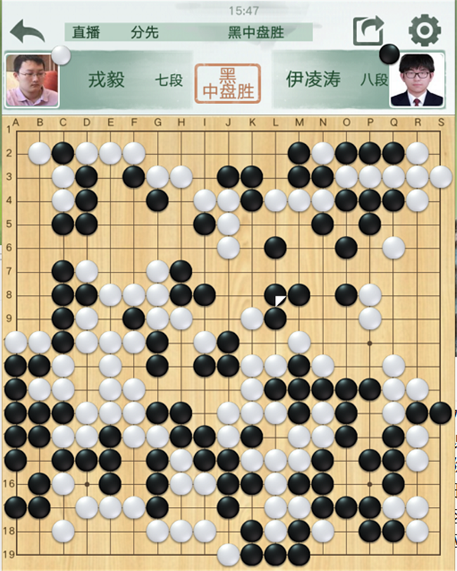 第三臺,戎毅執(zhí)白對陣伊凌濤。開局白棋不錯,左側(cè)沖擊黑棋薄弱處時候次序失誤,