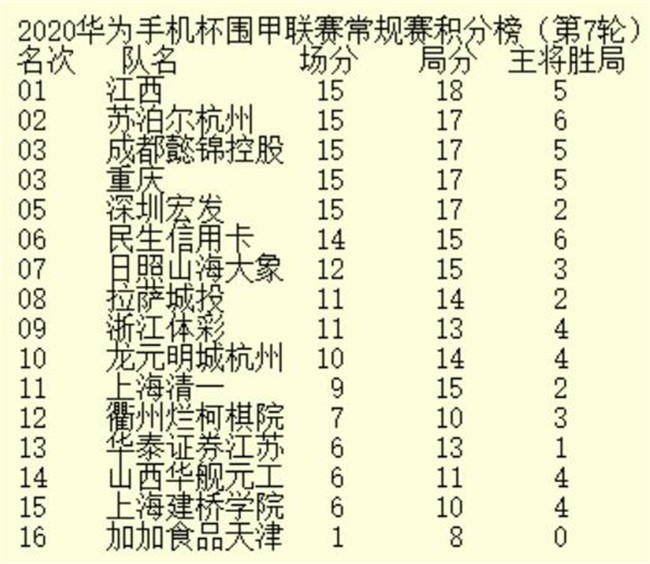 《2020年華為手機杯中國圍甲聯(lián)賽第七輪積分榜》