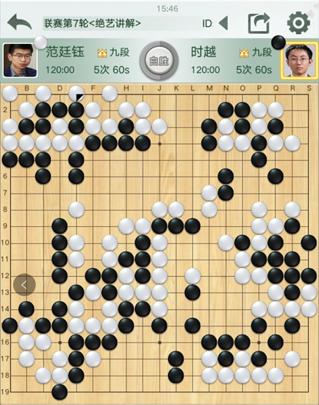 第二臺,時越執(zhí)黑對陣世界冠軍范廷鈺。開局白取地黑取勢,在中央的戰(zhàn)斗中,黑棋選擇開劫失誤,轉(zhuǎn)換后白棋勝勢。