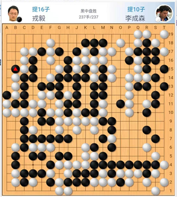 快棋臺由深圳隊的戎毅七段執(zhí)黑對陣天津隊的李成森五段。序盤平穩(wěn)過渡,進入中盤時黑棋在白上方大空中試應手,白棋最大程度強撐大空,留下隱患。在下方定型結束后,黑棋在白空中弈出巧手將白空打穿,取得領先。在劣勢情況下,白棋在爭搶官子時置中央大龍于不顧,黑棋攻殺白大龍順勢將白棋左下角吃掉,一舉獲勝。戎毅執(zhí)黑中盤勝李成森。
