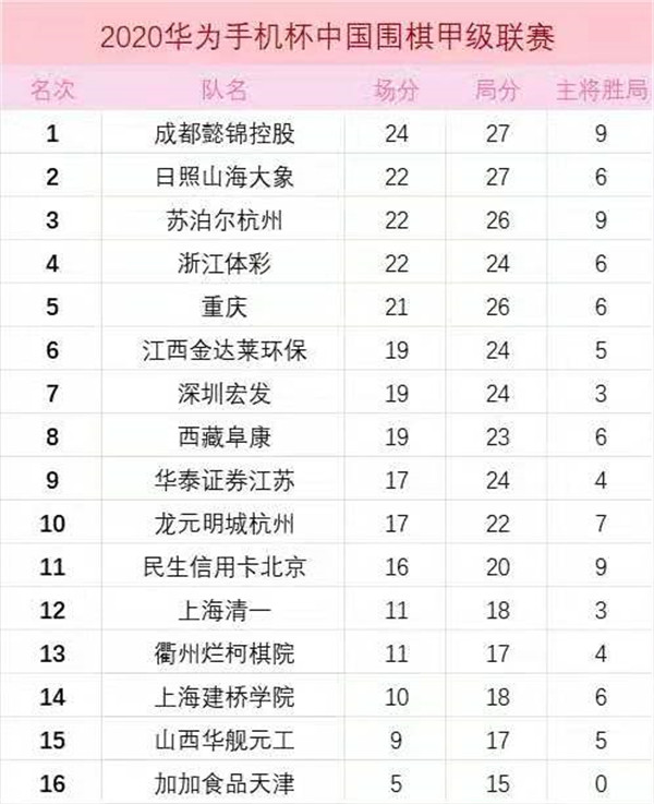 本輪深圳宏發(fā)隊3:1勝加加食品天津隊全取三分,目前積19分,暫列第七。本輪其它隊賽果如下:龍元明城杭州隊 2:2 重慶隊,上海建橋學院隊 1:3 成都懿錦控股隊,華泰證券江蘇隊 3:1 江西金達萊環(huán)保隊,日照山海大象隊 3:1 衢州爛柯棋院隊,西藏阜康 3:1 上海清一,浙江體彩隊 3:1 民生信用卡北京隊,蘇泊爾杭州隊 2:2 山西華艦元工隊。