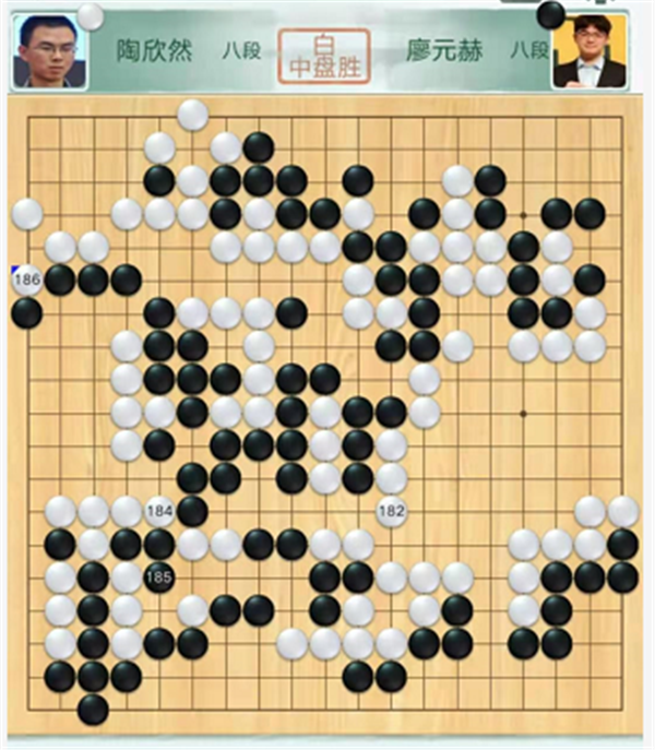 第四臺慢棋,由深圳隊陶欣然八段執(zhí)白對陣成都隊廖元赫八段。中央戰(zhàn)斗時候白棋選擇退讓,反倒形成打劫,黑棋劫勝后大幅領(lǐng)先。之后黑棋官子階段不夠冷靜細(xì)膩,幾處小虧損之后被白反超。黑棋看到局面危險更加沖動的選擇和白棋互相破空,結(jié)果又虧損導(dǎo)致差距越來越大。陶欣然執(zhí)白中盤勝廖元赫。