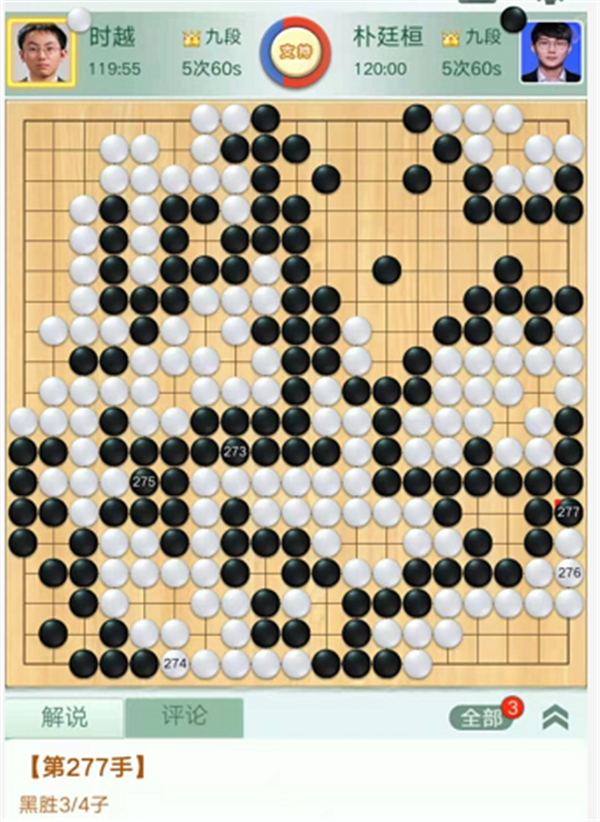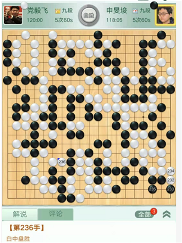 第一臺慢棋,由深圳隊的外援申旻埈九段執(zhí)黑對陣成都隊的世界冠軍黨毅飛九段。右下角白棋出現(xiàn)失誤,黑棋沒有抓住機(jī)會反而被白棋便宜不少。之后黑棋頑強(qiáng)追趕局面一度接近。但是官子階段黑棋始終沒有發(fā)現(xiàn)左上角官子便宜的小巧手,被白消除隱患后,白勝勢。申旻埈執(zhí)黑中盤負(fù)黨毅飛。