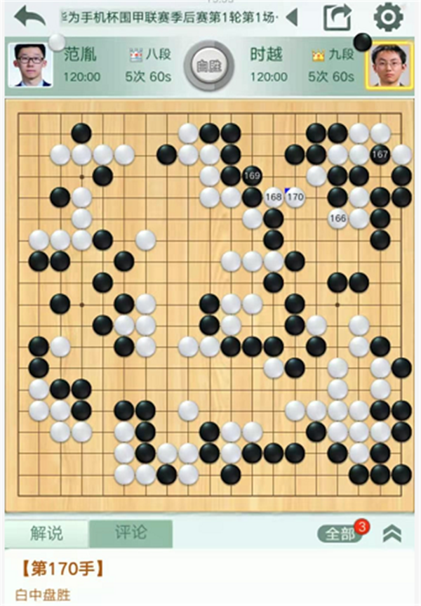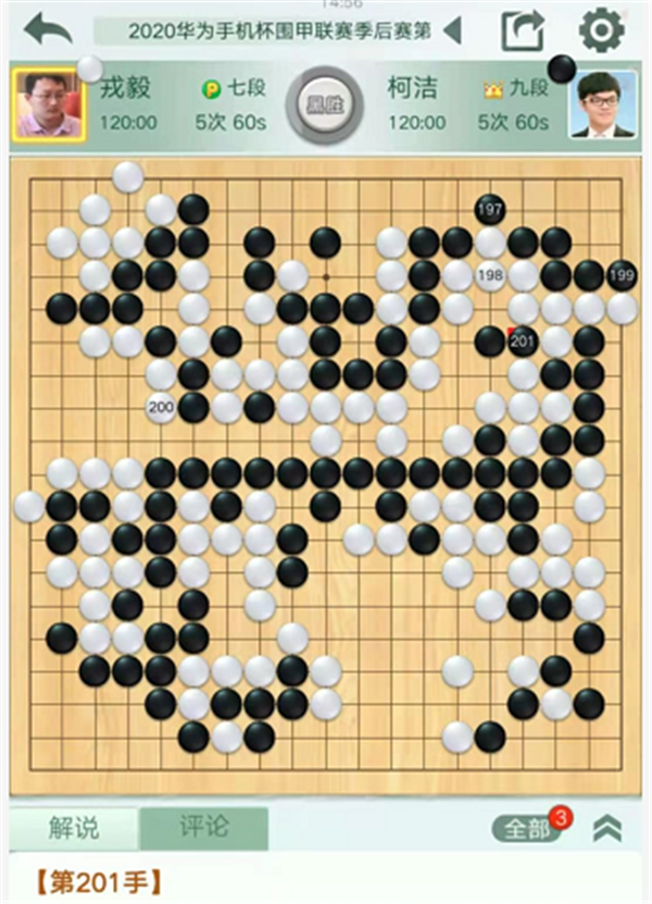 第三臺(tái)慢棋,由深圳隊(duì)的戎毅七段執(zhí)白對(duì)陣民生隊(duì)的柯潔九段。戎毅執(zhí)白對(duì)陣柯潔。開局左下變化新穎,白棋略有所得。之后右下角戰(zhàn)斗形成轉(zhuǎn)換,局面依然白好。右邊戰(zhàn)斗中黑棋形狀處理失誤,白棋簡(jiǎn)單整形將是大優(yōu)勢(shì)局面,但是白棋選擇了復(fù)雜的殺黑大龍的變化。最后白棋選擇和黑棋互相分?jǐn)鄬?duì)殺的話,將是白棋正好不行,實(shí)戰(zhàn)不得不放黑棋大龍連回后,白棋敗勢(shì)。最終戎毅執(zhí)白中盤負(fù)柯潔。