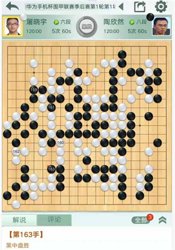 第四臺(tái)慢棋,由深圳隊(duì)陶欣然八段執(zhí)黑對(duì)陣民生隊(duì)的屠曉宇六段。開局雙方互圍大模樣。白棋右邊在黑空試應(yīng)手時(shí)黑方強(qiáng)烈反擊。白棋沒有下出做活的手段,不得不付出很大代價(jià)出頭跑出,黑優(yōu)勢(shì)。之后中央白棋混戰(zhàn)中戰(zhàn)略方向錯(cuò)誤,黑棋優(yōu)勢(shì)擴(kuò)大。最后黑棋在左邊白棋空里薄弱處出棋,一舉獲勝。陶欣然執(zhí)黑中盤勝屠曉宇。
