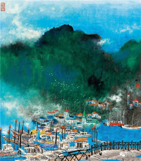 來自南京而定居于深圳的宋玉明,試圖將新金陵畫派表現(xiàn)現(xiàn)實(shí)的變革精神用于現(xiàn)代城市山水畫的探索上。作為新金陵畫派的第二代畫家,宋玉明直接承傳了宋文治表現(xiàn)現(xiàn)代太湖人居環(huán)境秀潤而精巧的家法,并將此種大山景加小民居的畫法轉(zhuǎn)用到深圳城市形態(tài)的表現(xiàn)上。這里,我們一方面可以看到深圳作為一個(gè)新興的現(xiàn)代城市借山而筑、注重自然環(huán)境在城市生態(tài)建設(shè)上的積極作用;另一方面,深圳這種與自然相統(tǒng)一的現(xiàn)代化城市建設(shè)理念,也為宋玉明進(jìn)行城市山水畫創(chuàng)作提供了完美的表現(xiàn)對象。在《深圳文錦渡》等作品里,我們看到了畫家巧妙地將城市現(xiàn)代建筑與自然山水融為一體的表現(xiàn)。這些畫作,大多以勾線渲染的方法表現(xiàn)遠(yuǎn)景中的商用或市政建筑設(shè)施,也因這些建筑被設(shè)置在中遠(yuǎn)景,不僅減少了建筑塑造的困窘,而且突出了這些人居建筑與自然相得益彰的和諧關(guān)系。這些畫作,從嚴(yán)格的意義上說,仍然是山水畫,而宋式小散鋒皴以及云煙雨霧的渲染,也為畫面增添了幽深、恬靜、高雅、平和的意趣與境界。這些畫作,讓我們所熟悉的城市從一個(gè)相對遙遠(yuǎn)的視角來觀看,既因距離產(chǎn)生了一種從未體驗(yàn)過的美感,也較好地體現(xiàn)了現(xiàn)代城市與自然占位的協(xié)調(diào)統(tǒng)一、舒適宜居的比例關(guān)系。
