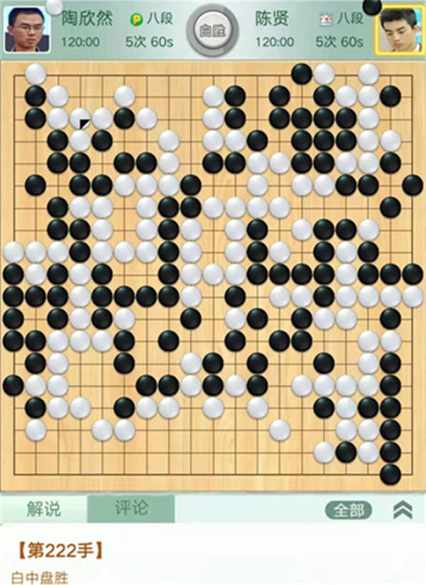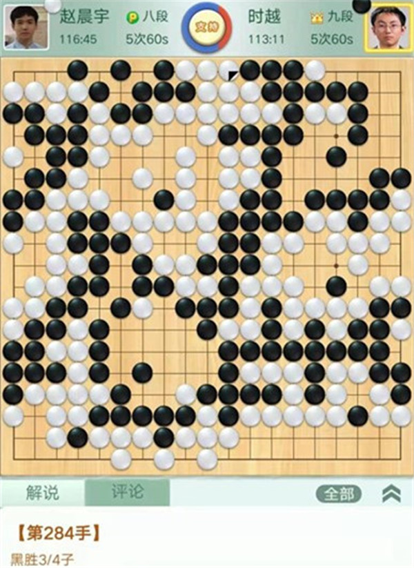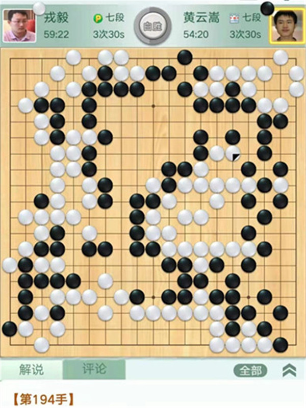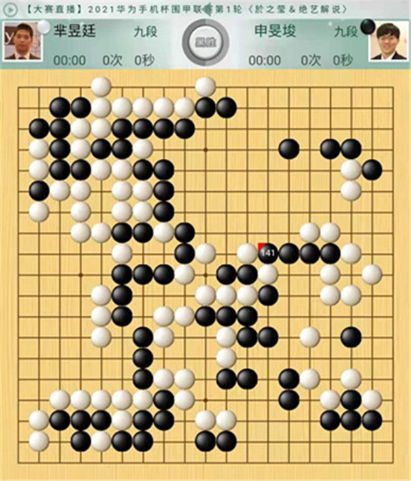 今日比賽中,申旻俊主將執(zhí)黑對陣新二冠羋昱廷,開局左上角申旻俊配合小米使出羋氏飛刀,結果是飛刀不成功黑棋局面領先。中盤黑棋攻擊中央白棋時,白棋脫先搶占實地。被黑手起刀落斬殺大龍,局終??炱迮_,去年屢立戰(zhàn)功的戎毅七段執(zhí)白對陣黃云嵩七段,行棋穩(wěn)健,占居三個角之后,又在中間活出一大塊,行棋至194手勝。三臺陶欣然八段對陣陳賢八段,行棋222手白中盤勝。四臺時越九段對趙晨宇一戰(zhàn),行至284手,以四分之三子微弱優(yōu)勢取勝。