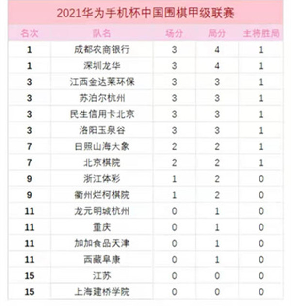 第一輪其余參賽各隊戰(zhàn)況如下:成都農商銀行隊4:0勝上海建橋學院隊;西藏阜康1:3洛陽玉泉谷;蘇泊爾杭州3:1加加食品天津;民生信用卡北京隊3-1龍元明城杭州。首輪過后,深圳、成都隊居第一方陣;江西、杭州、北京、洛陽居第二方陣。圍甲積分榜排名如下:
