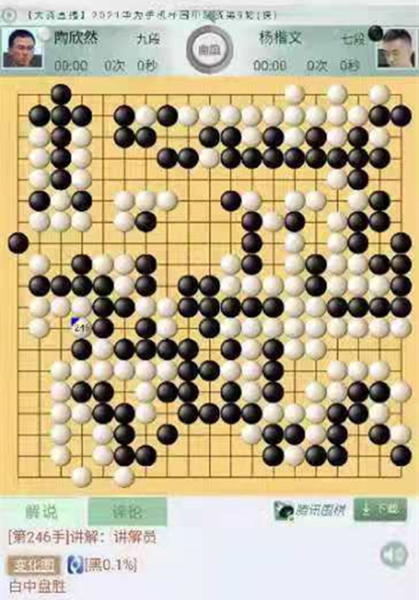三臺(tái)陶欣然執(zhí)白對(duì)陣等級(jí)分排名29位的楊楷文。開(kāi)局右邊黑棋沖擊白棋將白分?jǐn)?,但是由于棋形沒(méi)有下對(duì),反而用來(lái)斷開(kāi)白棋的棋筋被吃,白棋早早進(jìn)入勝勢(shì)。這一盤是此輪深圳龍華隊(duì)唯一勝局,不易!為陶欣然點(diǎn)贊!