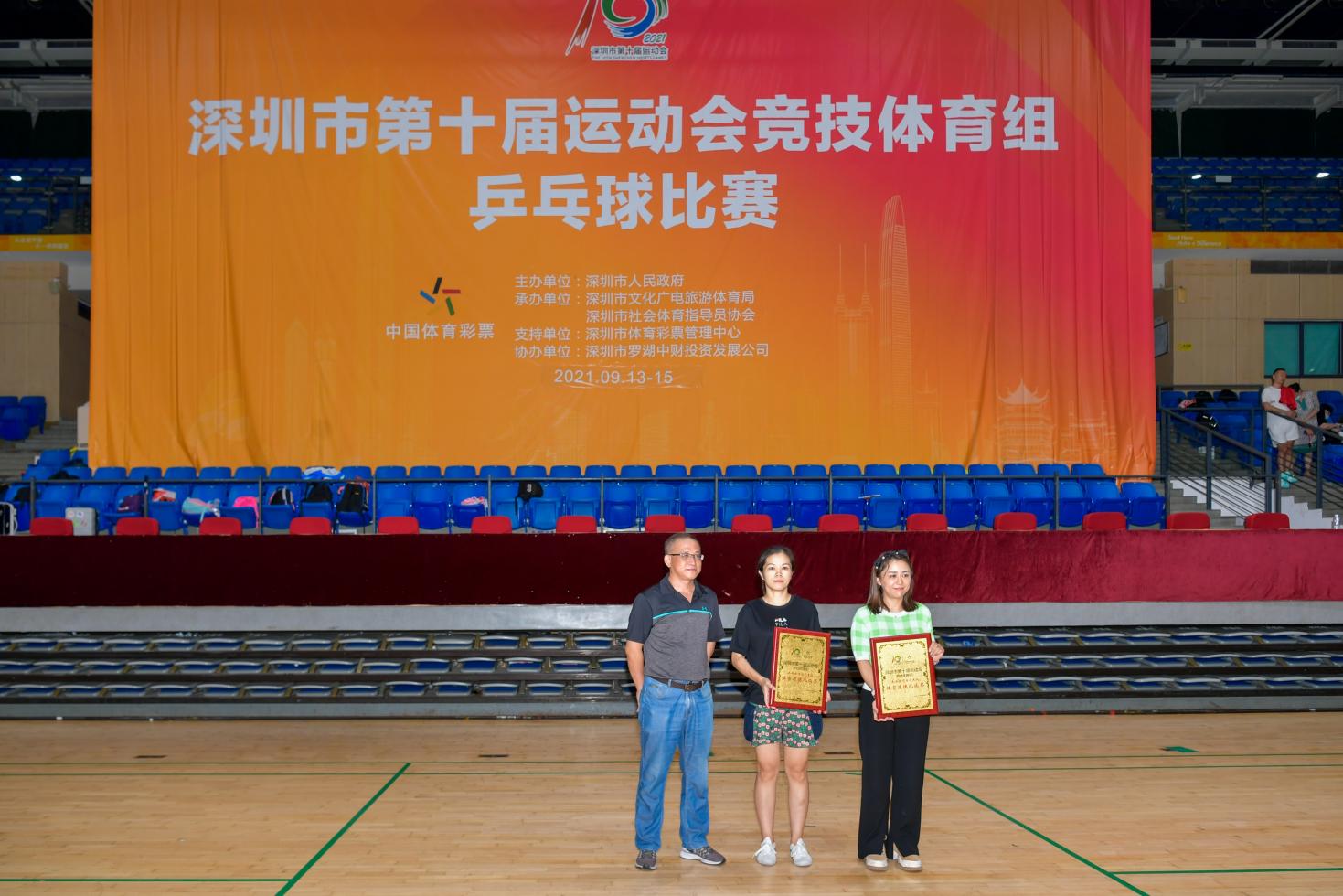 深圳市羅湖中財(cái)文體場館管理部部長李志軍(左1 )為獲獎(jiǎng)運(yùn)動(dòng)員頒獎(jiǎng)