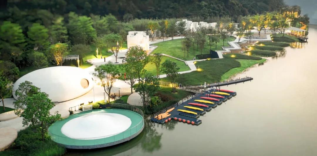 小鎮(zhèn)除規(guī)劃有安藤忠雄禮堂四部曲之一的“詩(shī)之禮堂”,還邀請(qǐng)了國(guó)內(nèi)外一眾頂級(jí)設(shè)計(jì)師參與設(shè)計(jì),張?zhí)凭坝^作品——龍骨樂(lè)園、WATG作品——棕櫚樹(shù)酒店、鄭東賢作品——高街,還有MORSE COFFEE、社交廚房、深夜食堂等配套建筑,實(shí)現(xiàn)居住、休閑、度假、教育、社交和精神文化等空間一體融合,締造了大灣區(qū)首選的深度休閑度假目的地。