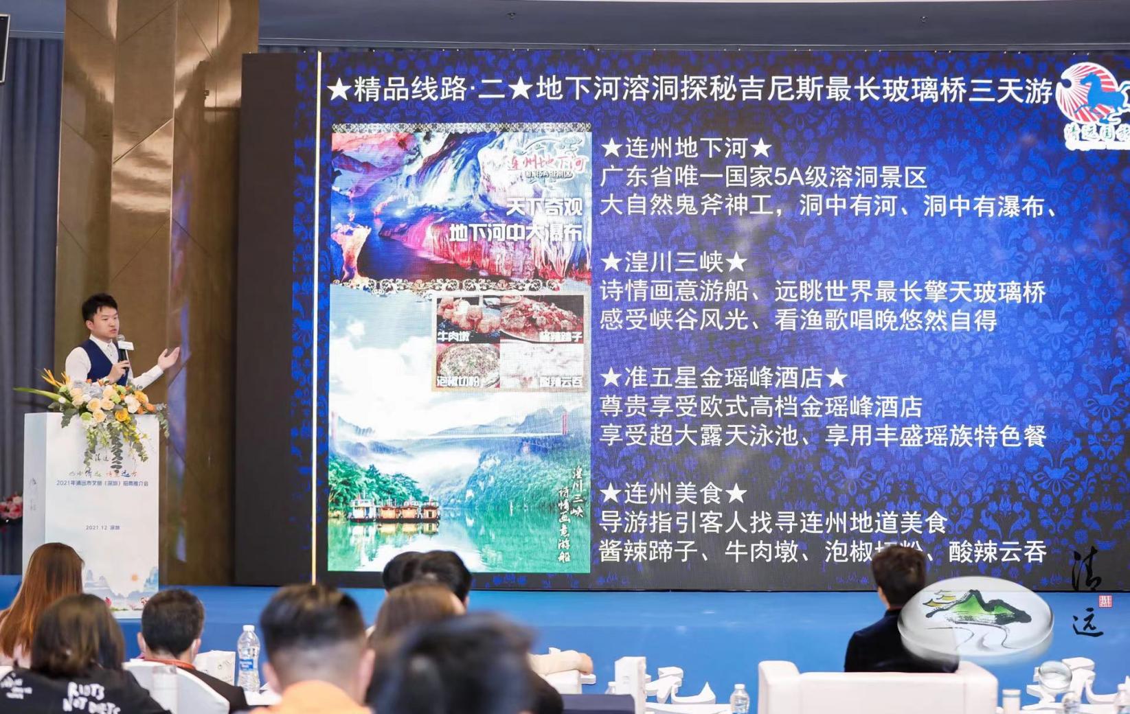 文化是旅游的靈魂,旅游是文化的載體。近年來,清遠依托自然資源稟賦和深厚的文化底蘊,多措并舉推動文旅融合發(fā)展,文旅產(chǎn)業(yè)呈現(xiàn)欣欣向榮局面?,F(xiàn)場,清遠市珠水美悅酒店管理有限公司總經(jīng)理宋玉亮、清遠市古龍峽生態(tài)旅游娛樂有限公司營銷專員林嘉儀、清遠市愛地旅游發(fā)展有限公司營銷經(jīng)理楊舒浩、清遠市國業(yè)旅游開發(fā)有限公司常務(wù)副總經(jīng)理韓勇,依次以圖文并茂、聲畫結(jié)合的形式,推介了美林湖景區(qū),古龍峽景區(qū),連州地下河、湟川三峽、龍?zhí)犊蜅?、擎天玻璃橋、連州大酒店,峰林曉鎮(zhèn)、洞天仙境,讓與會人員身臨其境感受山水清遠的魅力;清遠市國旅國際旅行社有限責任公司業(yè)務(wù)總監(jiān)李國華則現(xiàn)場推介了古龍峽云天玻霸兩天游、地下河溶洞探秘及吉尼斯最長玻璃橋三天游等5條精品旅游線路,現(xiàn)場“種草”清遠眾多網(wǎng)紅打卡點。