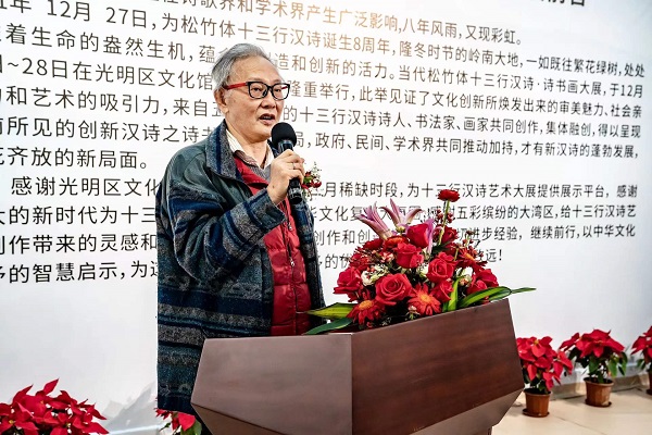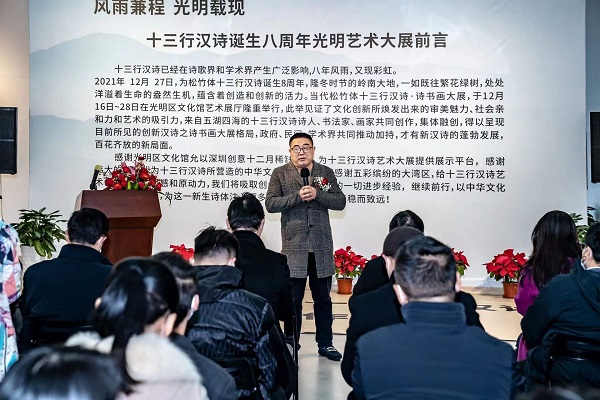 讀特客戶端·深圳新聞網(wǎng)2021年12月29日訊(記者 田志強(qiáng))近日,國家社科基金項(xiàng)目“當(dāng)代漢詩創(chuàng)新詩體研究”階段性成果展——十三行漢詩書畫作品展,于光明區(qū)文化館成功舉辦。本次展覽集中展示本項(xiàng)目重要研究成果、全國各地新漢詩詩人的原創(chuàng)十三行漢詩之書畫作品等。十三行漢詩創(chuàng)立八年以來,得到了海內(nèi)外詩人的廣泛關(guān)注,在國家社科基金研究團(tuán)隊(duì)精研闡釋的基礎(chǔ)上,得到了學(xué)術(shù)界的肯定。