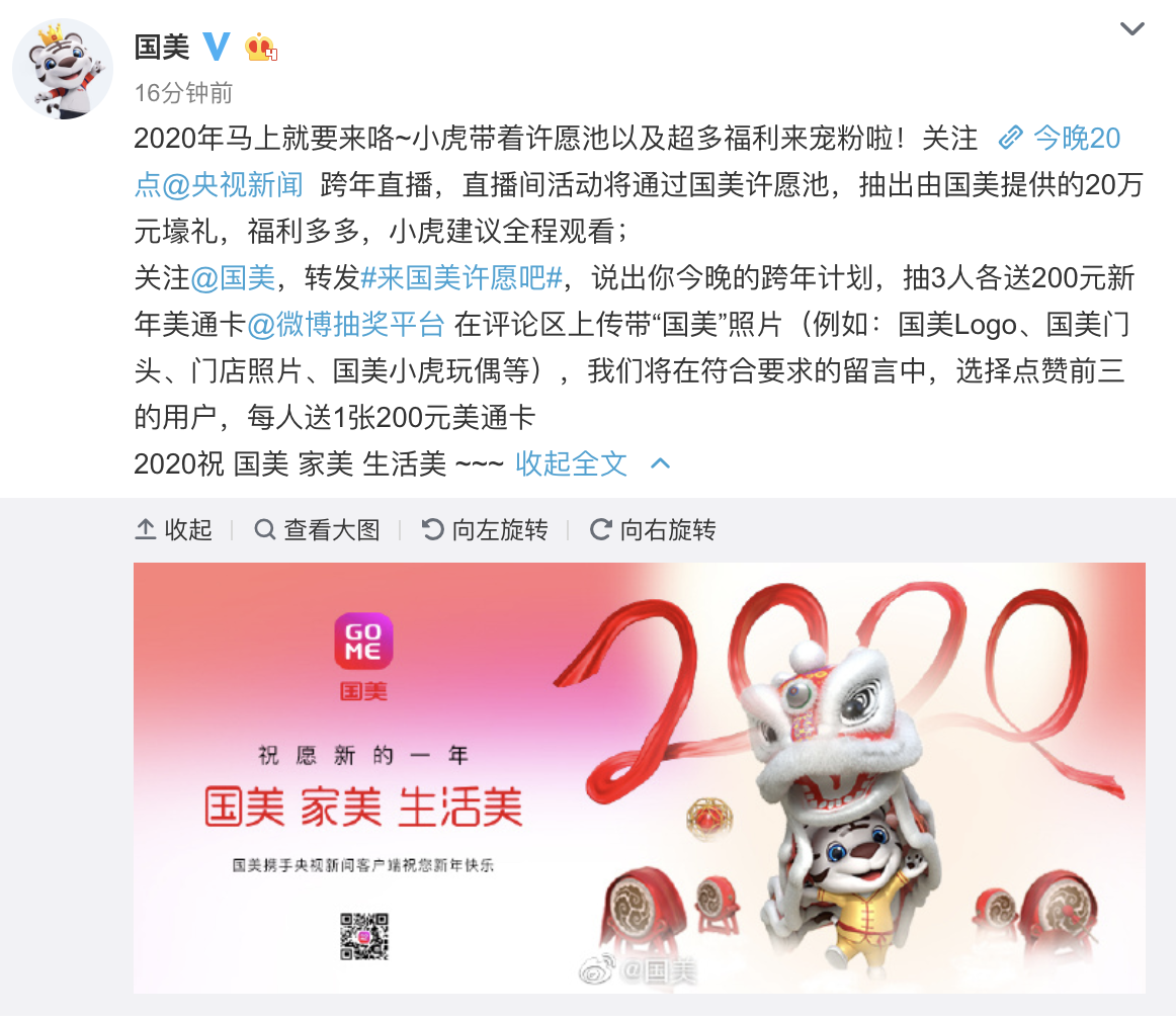 跨年就是要大聲說(shuō)出你的心愿,趕快@國(guó)美幫你圓夢(mèng)。活動(dòng)當(dāng)天,國(guó)美官方微博將與央視新聞同步抽獎(jiǎng),2019年12月31日17點(diǎn)起至2020年1月1日不同時(shí)間段抽取多項(xiàng)大獎(jiǎng),其中最高獎(jiǎng)項(xiàng)為價(jià)值2020元國(guó)美美通卡1張。