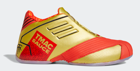 ? TMAC 1: 聯(lián)名款TMAC1采用金 屬色鞋面,搭配紅色細節(jié),外底綴金色拱門印花,致敬巨無霸醬——風靡全球的巨無霸漢堡的獨特醬料。同時該鞋款也蘊含麥蒂獨特“風味配方”:干拔跳投、三分球、背身單打。
