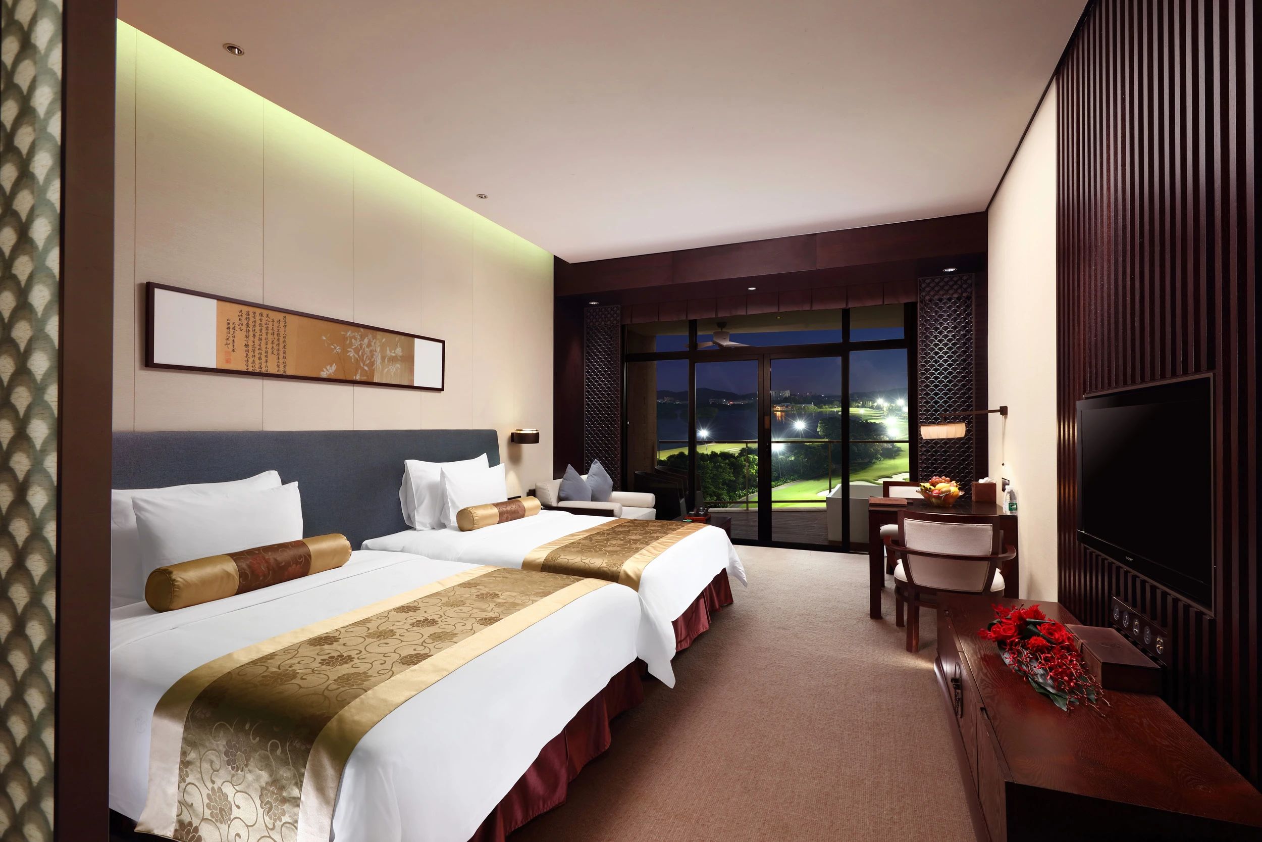 我們這次下榻的是42㎡的豪華客房,以中國風為美學設(shè)計,床頭是韻味十足的古風字畫,中式銅鎖、陶瓷擺件……藝術(shù)品無處不在。