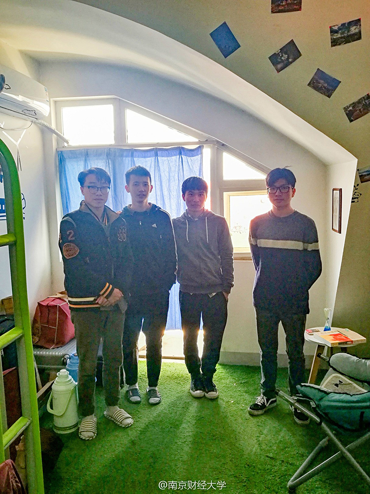 綿綿的草坪、充滿設(shè)計(jì)感的書架、掛著素描畫的墻……難以想象這是四個(gè)19歲男生的寢室。南京財(cái)經(jīng)大學(xué)西苑9幢男生宿舍頂樓602寢室,住著4位“世外高人”—— 涂貴平、柯毅、劉以康和廉鎮(zhèn)宇,他們用事實(shí)告訴大家,男生宿舍文藝起來,可絲毫不輸女生。