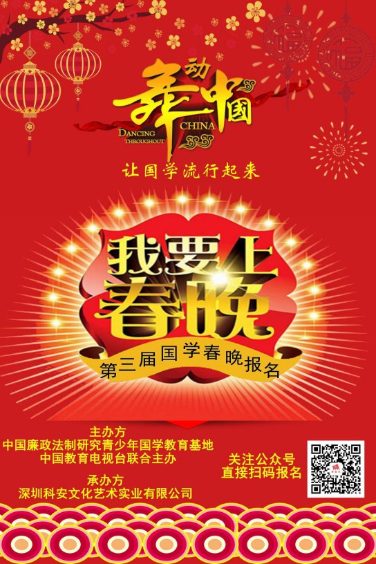 2019年第三屆國學春晚由青少年國學教育基地與中國教育電視臺聯(lián)合主辦,本次春晚打破以往以晚會為主導的籌辦模式,更注重國學文化的推廣及全民國學才藝的選拔。首次以主辦方的報道與宣傳規(guī)模在全國范圍內(nèi)進行海選。以“舞動中國”為主題在全國范圍內(nèi)進行強勢推廣,發(fā)出中國國學文化領域的最強音!在長達4個多月的宣傳活動期間,將不間斷運用活動背景、輻射人群、媒體資源、賽事平臺及網(wǎng)絡優(yōu)勢等方式弘揚國學。