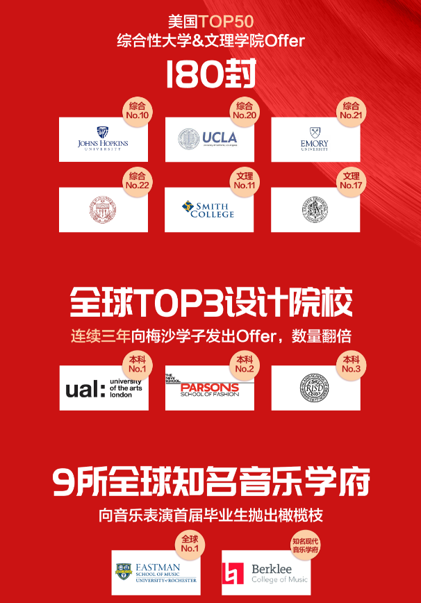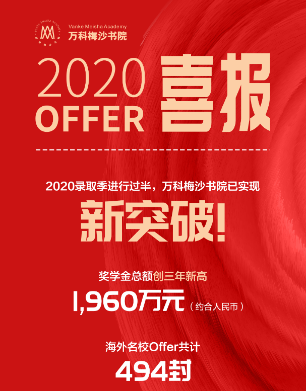 2020申請季還未結束,梅沙學子已收獲494封海外名校錄取Offer,獎學金累計約合人民幣1,960萬元,創(chuàng)三年新高。其中,來自美國Top100綜合性大學及文理學院的錄取通知書有356份,來自美國Top50綜合性大學及文理學院的錄取通知書有180份。