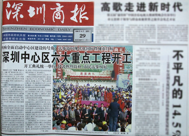 1998年12月29日,深圳商報(bào)頭版報(bào)道深圳中心區(qū)六大重點(diǎn)工程開工
